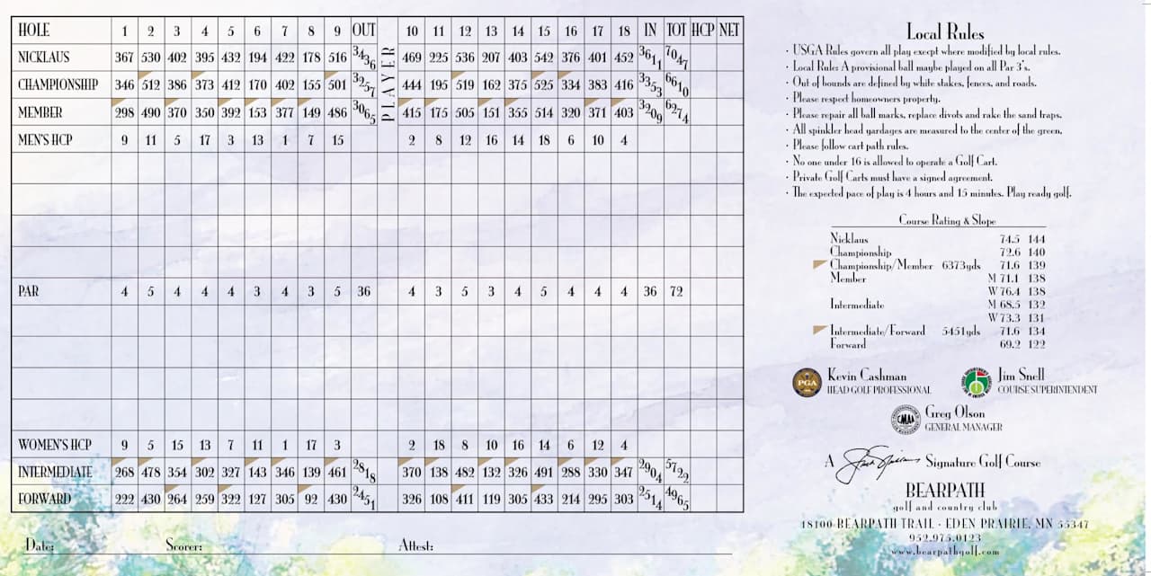 Designed by Jack Nicklaus, Bearpath is a premiere Signature Course in the Nicklaus Design family. With Jack's personal touch on the design, Bearpath offers a wonderful challenge to golfers through the Nicklaus character of risk, reward and strategy. Opening in 1996 with Jack's inaugural round, the course is nestled around the beautiful property of wetlands, Middle Riley Creek and bordering Lake Riley. The Bearpath experience is cultivated by the culture of the club with exciting events, many mixers, and happenings along with a membership that enjoys the lifestyle of the club. With five sets of tees ranging with forward tees at 4965 yards to over 7,000 from the Nicklaus tees, Bearpath offers all you desire on the course! Come ready to play!
