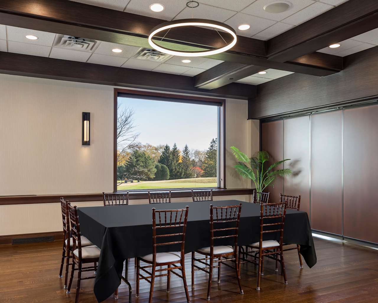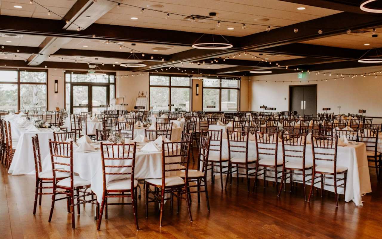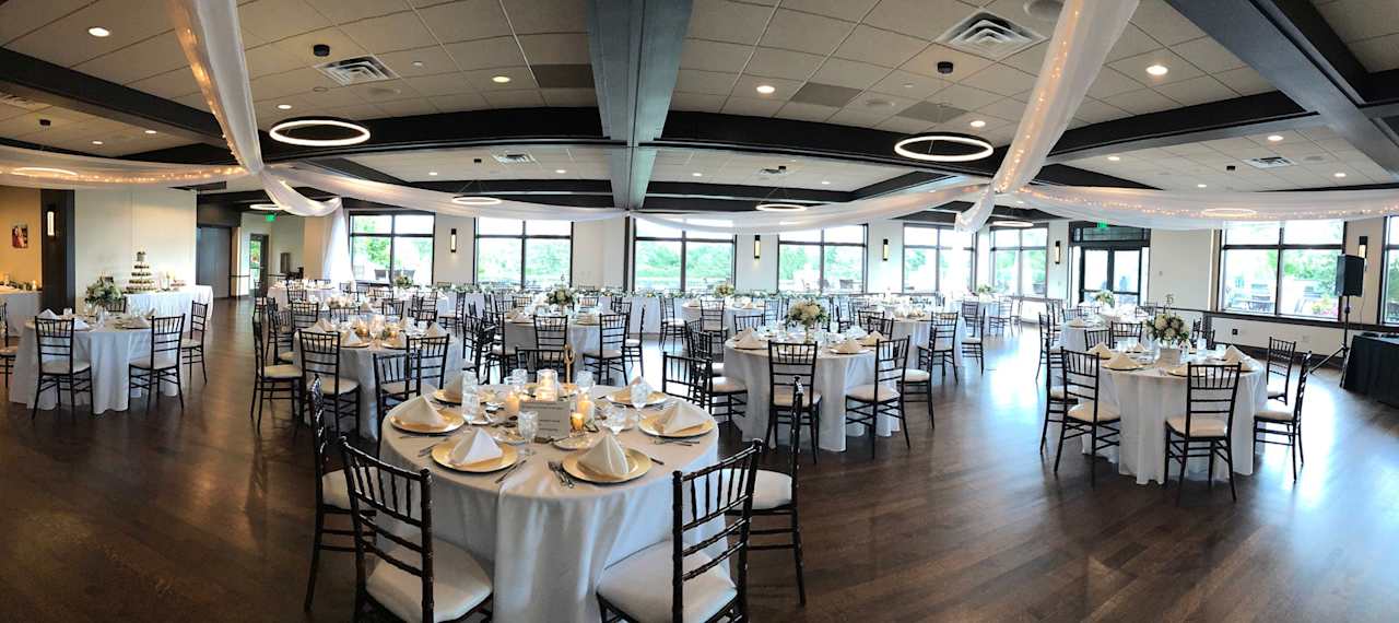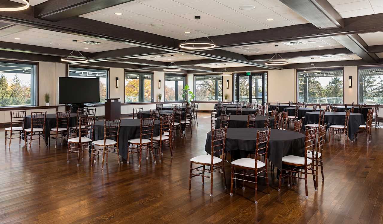 The newly remodeled ballroom boasts beautiful dark hardwood floors, ceiling beams and contemporary finishes. Grand windows throughout the space flaunt stunning views of the 18th green and waterfall pond, while natural light pours strikingly into the space. A newly designed deck wraps around the room, creating the perfect ambiance for you and your guests during social hour or after dinner drinks. The ballroom can accommodate any group size, from 10 to 250. A private modern bar creates the perfect flow for guests to enjoy a refreshing craft beer from our rotating lines, a glass of wine from our extensive wine list or a custom handcrafted cocktail. Equipped with a high-tech sound system, A/V equipment and rolling screens for presentations - the ballroom is the perfect space for corporate events and large parties.